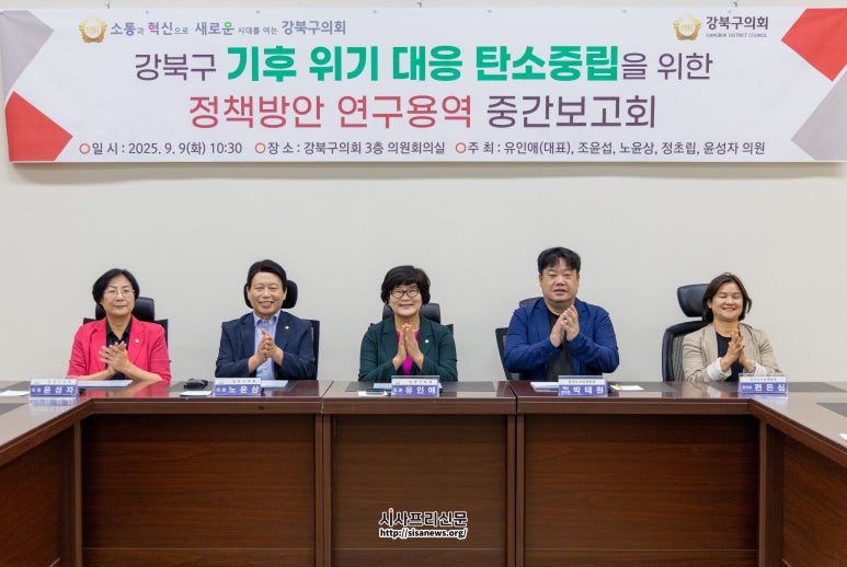 강북구의회 기후위기 대응 탄소중립을 위한 연구회 ‘중간보고회’ (시사프리신문=유영일 기자) 강북구의회(의장 김명희) 의원연구단체인 ‘강북구 기후위기 대응 탄소중립을 위한 연구회’ (대표의원 유인애)는 지난 9월 9일, 의회 3층 의원회의실에서 중간보...