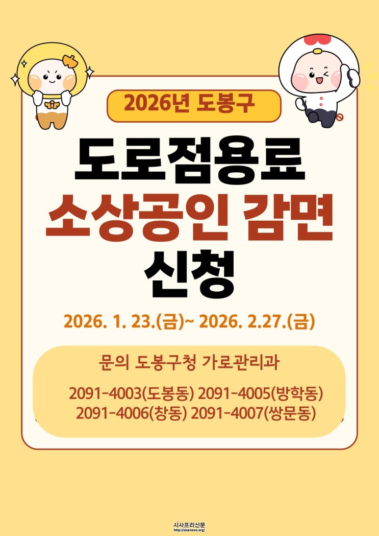 도봉구, 소상공인 대상 도로점용료 25% 감면 2월 27일까지 신청 신청서 등 가로관리과로 제출 2월 27일까지 도봉구(구청장 오언석)가 지역 소상공인을 대상으로 도로점용료를 25% 감면한다. 경기침체로 어려움을 겪는 지역 소상공인의 경제적 부담을 완화하...