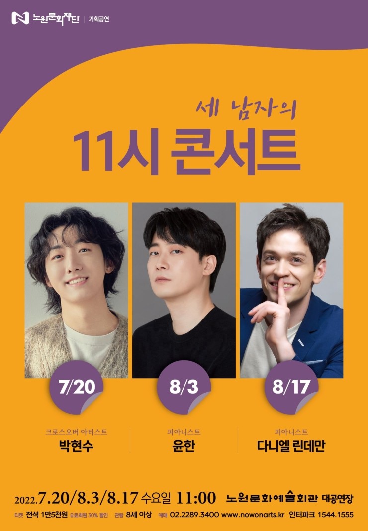 노원구(구청장 오승록)가 5년간 이어온 노원문화예술회관의 대표 공연 ‘음악 브런치 콘서트’를 올해도 진행한다. 콘서트의 제목은 ‘세 남자의 11시 콘서트’다. 7. 20.(수), 8. 3.(수), 8. 17.(수) 오전 11시, 노원문화예술회관 대공...