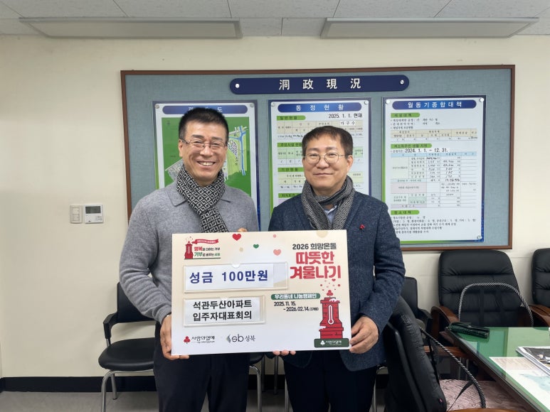 성북구 석관동 두산아파트 입주자대표회의, 이웃돕기 성금 전달 ‘2026년 희망온돌 따뜻한 겨울나기’ 사업 참여 성금 기탁 성북구 석관동 두산아파트 입주자대표회의, 이웃돕기 성금 전달 성북구(구청장 이승로) 석관동 두산아파트 입주자대표회의가 올겨울에도 지역사회 나눔...