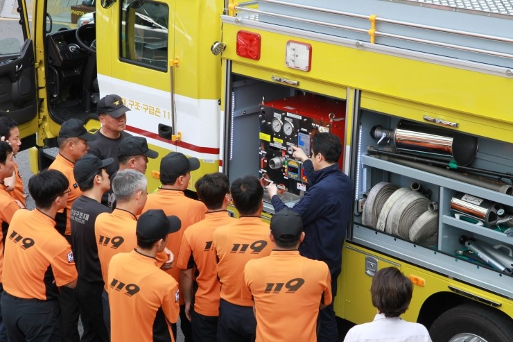 서울 성북소방서(서장 민춘기)는 27일 오후 직원들을 대상으로 최근 배치된 고성능 화학차 기능 숙달 훈련을 실시했다. 이번에 배치된 신규 화학차는 물+폼+압축공기를 동시에 방사하여 압축공기포를 생성하는 방식으로 화재표면에 직접 접착하여 흘러내리지 않아 유류화...