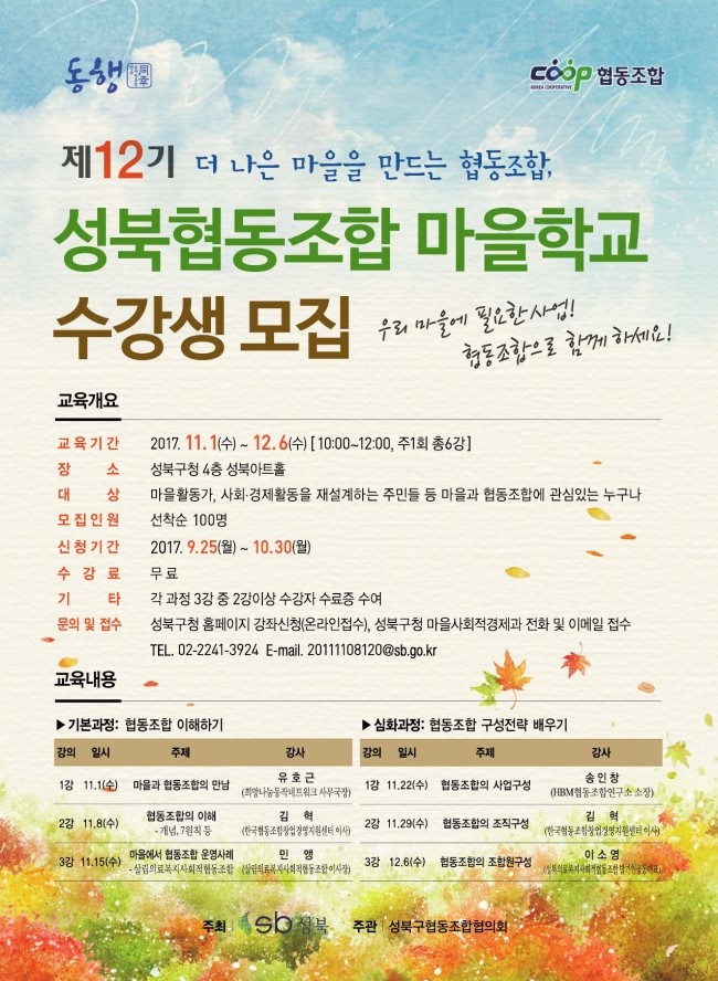사업선정 및 조합원 구성 등 협동조합 구성전략의 전 과정을 마을학교에서 배운다 성북구(구청장 김영배)가 오는 11월 1일부터 12월6일까지(오전 10시~12시) 매주 수요일 성북구청 4층 성북아트홀에서 협동조합에 관심 있는 지역 주민들을 대상으로 제12기 성...
