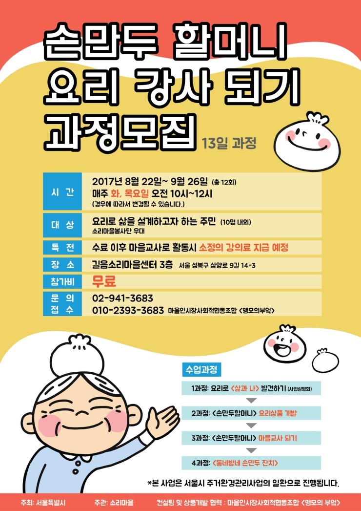 울 성북구(구청장 김영배) 길음소리마을(성북구 삼양로9길 14-3)에서는 어르신 ‘손맛’ 봉사 프로젝트가 한창이다. 길음소리마을센터 주민공동체운영위원회(이하 센터)는 8월 22일부터 9월 26일까지 어르신 ‘손맛’ 봉사 프로젝트, 그 두 번째로 ‘손만두 할...