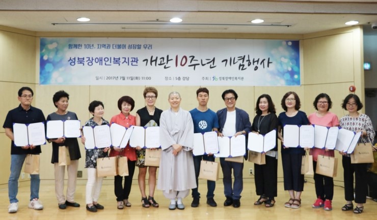 성북장애인복지관 (관장 선재스님)의 개관 10주년 기념행사가 7월 11일 오전 복지관 5층 강당에서 ‘함께한 10년, 지역과 더불어 성장할 우리’로 성황리에 개최됐다. ‘장애인과 함께, 지역사회와 함께 실천하는 복지관’이라는 비전에 발맞추어 7월 3일부...