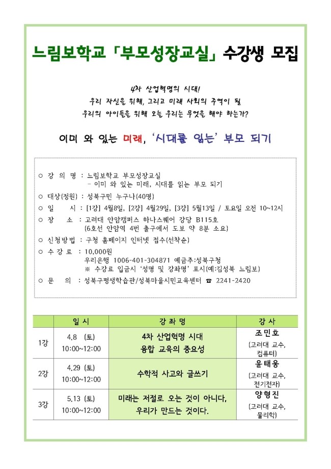 “4차 산업혁명의 시대!”, “우리 자신을 위해, 그리고 미래 사회의 주역이 될 우리 아이들을 위해 오늘 우리는 무엇을 해야 하는가?” 성북구(구청장 김영배)와 사단법인 느림보꿈터가 4차 산업혁명의 시대를 맞아 ‘이미 와 있는 미래, 시대를 읽는 부모 되기’의 주제...