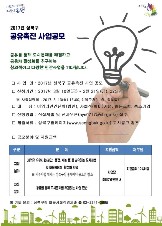 성북구(구청장 김영배)가 오는 31일까지 사회적기업, 협동조합, 중소기업, 비영리법인·민간단체 등을 대상으로 공유촉진 사업을 공개 모집한다. 지역 유휴공간, 주민들의 물건, 재능, 경험 등 자원의 공유를 통해 사회·경제·환경적 가치를 창출하고 지역문제를 해결...