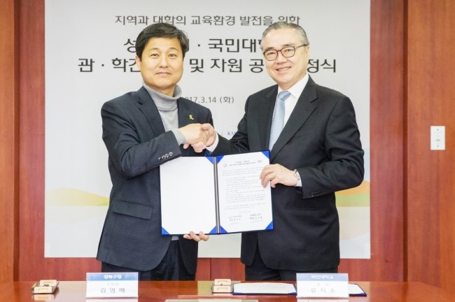 성북구(구청장 김영배)와 국민대학교(총장 유지수)가 지난 14일(화) 국민대 본부관에서 ‘관·학간 정보 및 자원 공유 협정’을 체결하고 지역과 대학의 교육환경 발전을 위한 동행(同幸)의 길을 열었다. 협정식에는 김영배 성북구청장과 유지수 국민대학교 총장을 비롯한 ...