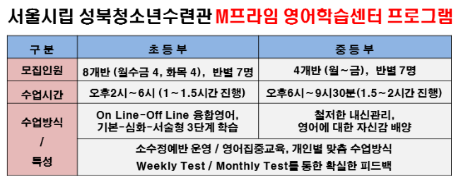 서울시립 성북청소년수련관(관장 정성현)이 성북구 지역 학부모들의 자녀 사교육비 부담을 덜어주기 위해 시설 내 ‘M프라임 영어학습센터’ 영어교실 수강생을 모집하고 있다. 모집대상은 초등학생과 중학생이며, 학년과 개인수준을 고려 학급당 최대 7명으로 수강생을 제한하...