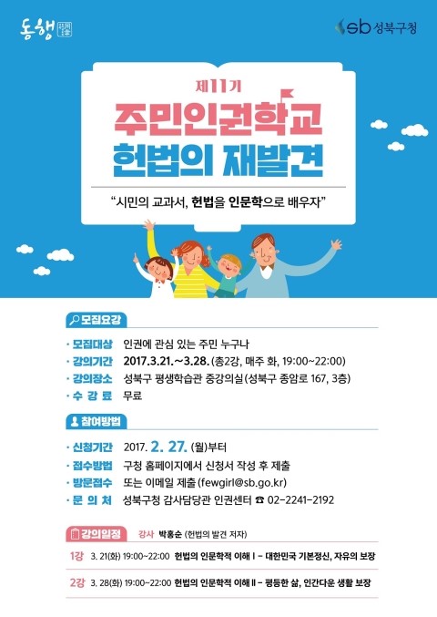 성북구(구청장 김영배)가 오는 3월 21일과 28일, 평생학습관에서 주민들을 대상으로 제11기 주민인권학교를 개설한다고 밝혔다. 구는 2012년부터 주민의 인권문화 확산과 인권활동가를 양성하기 위해 매년 상·하반기 두 차례씩 주민 대상 인권교육을 실시하...