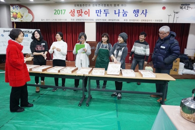 성북구(구청장 김영배)성북동에서는 설 명절을 일주일 앞둔 21일 토요일 오전 11시, ‘만두 나눔의 날’이 열려 효도 동행(同幸)의 장이 펼쳐졌다. 주말임에도 불구하고 성북동 새마을부녀회(회장 이화심)를 비롯한 주민들과 서울연극협회 송형종 회장과 배우 정종...