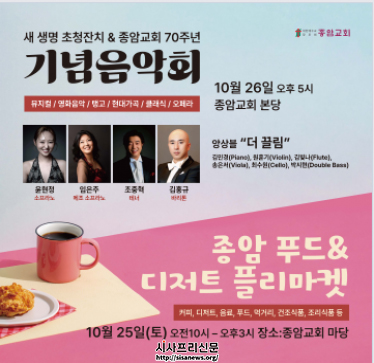 종암교회, 창립 70주년 맞아 음악회·플리마켓 열어 함께 나누는 열린 교회로서 신앙 70년, 이웃과 함께한 발자취 ▲종암교회, 창립 70주년 맞아 음악회 포스터  (시사프리신문=정진만 기자) 성북구 종암동을 지켜온 종암교회가 창립 70주년을 맞...