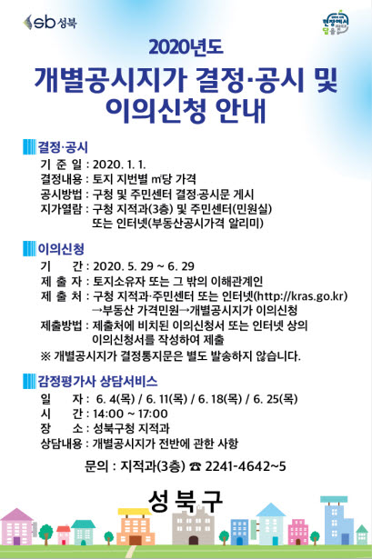 성북구(구청장 이승로)는 2020년 1월 기준으로 조사. 산정한 개별공시지가를 결정․공시하고, 오는 29일까지 토지소유자 및 그 밖의 이해관계인에게 이의신청 접수를 받는다. 이번에 결정․공시된 토지는 총 55,056필지로 각종 조세 및 부담금 부과의 기준으로 ...