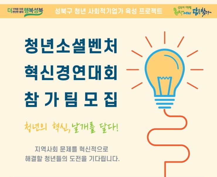 성북구(구청장 이승로)는 지역사회 문제를 창의적이고 혁신적인 방법으로 해결할 청년 사회적기업가 육성을 위해 「청년 소셜벤처 혁신경연대회」 참가팀을 모집한다. 「청년 소셜벤처 혁신경연대회」는 사회변화를 꿈꾸는 청년들의 참신하고 역량 있는 아이디어를 공...