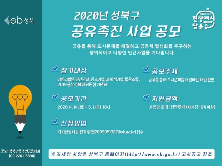 성북구(구청장 이승로)는 ‘2020 성북구 공유촉진 공모사업’을 추진한다. 구는 15년부터 공유경제 활성화를 위해 총 19개 공유사업 개발 약 1억 2400만 원의 사업비를 지원하였다. 특히, 작년에는 지역의 사회적경제기업(사회적기업, 협동조합)이 참여하여 폐...