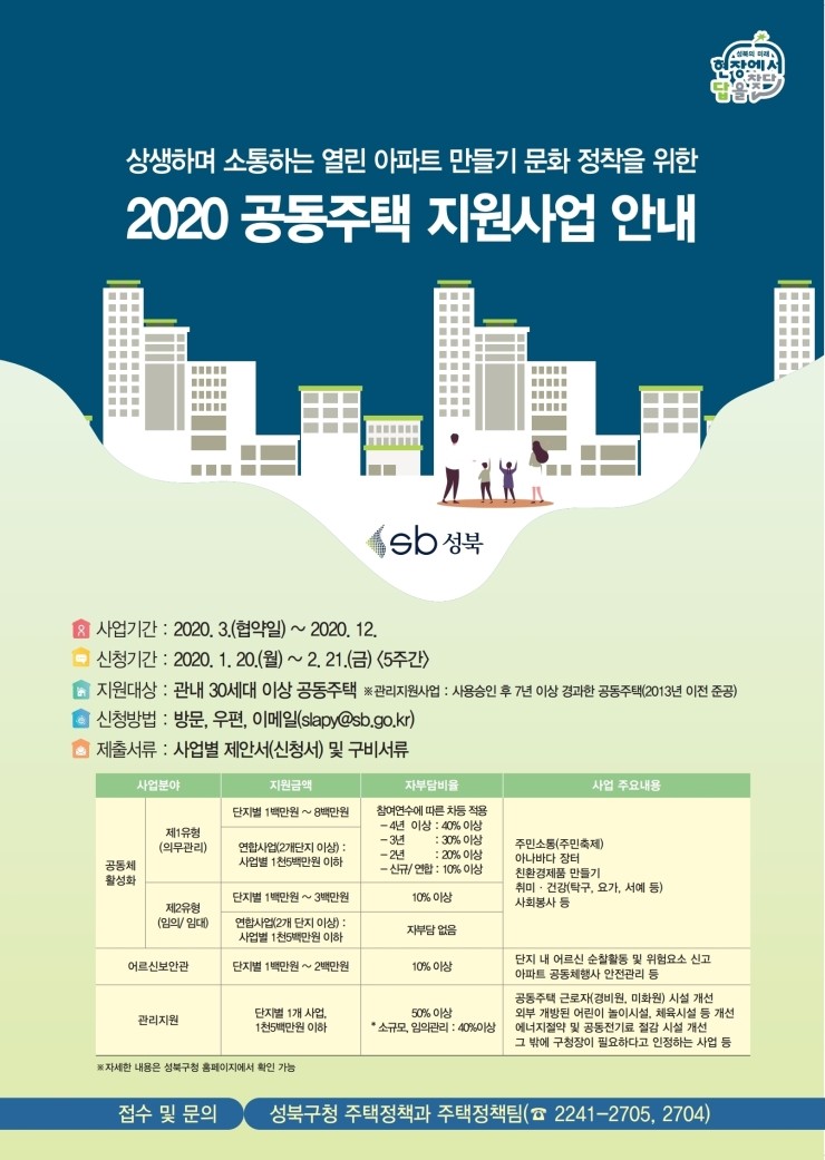 성북구(구청장 이승로)는 소통하는 열린 아파트 만들기 문화 정착을 위하여 2월 21일까지 공동주택 지원사업 신청을 받는다. 이번 공동주택 지원사업은 성북구에 있는 30세대 이상의 공동주택을 대상으로 ▲공동체 ...