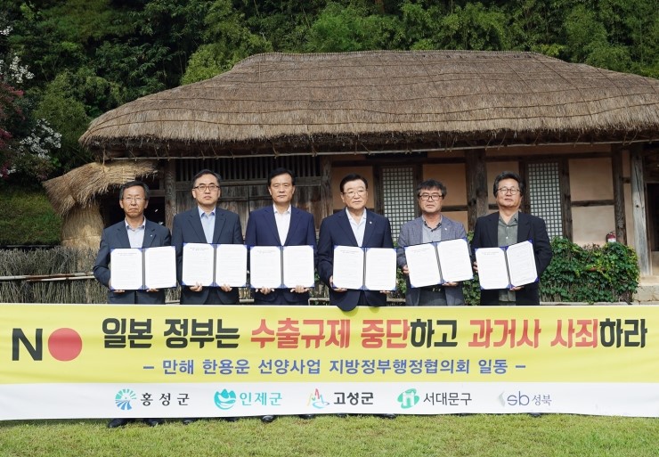 만해 한용운 선양사업 지방정부행정협의회(회장 김석환, 홍성군수)가 지난달 29일 홍성군 만해 한용운 생가지에서 ‘일본의 수출규제 규탄 성명서’를 발표했다. 만해 한용운 선양사업 지방정부행정협의회 소속 5개 지방정부(홍성군:군수 김석환, 인제군:군수 최상기, 고...
