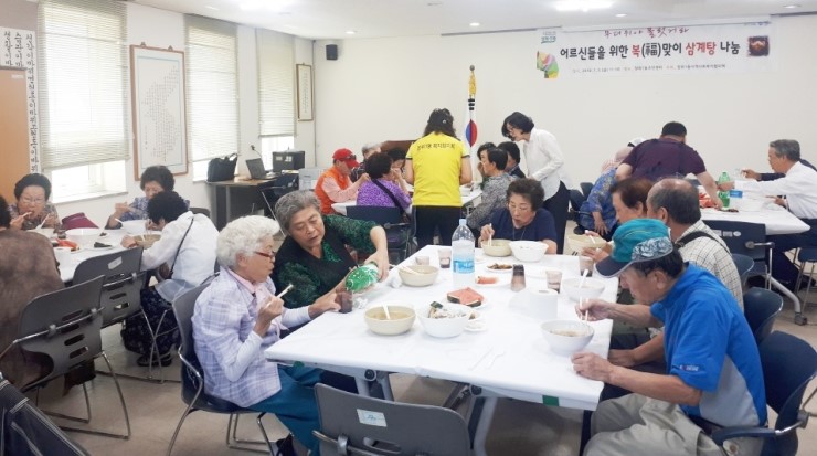 성북구 장위1동 지역사회복지협의체(회장 이순자)는 지난 5일(금) 장위1동 주민센터 2층에서 저소득 어르신 60명을 모시고 삼계탕을 대접하고, 『행복한 아이는 마을을 꿈꾸게 한다.』 프로그램 운영으로 만들어진 부채를 나누어드렸으며, 관내 경로당 5곳에는 수박과 떡...