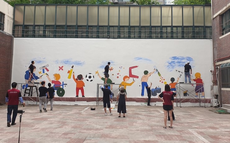 고대85학번 동기 ‘우리함께-고대85봉사단’이 지난 8일 모교 소재지인 성북구(구청장 이승로) 정덕초등학교에서 벽화그리기 재능기부 봉사활동을 펼쳐 눈길을 끌고 있다. 전국 각지에서 활발히 활동하고 있는 고대85학번 동기들과 고려대학교 사회봉사단(KUSSO...