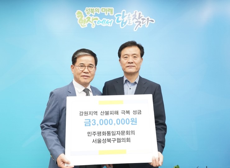 (시사프리신문=김면수 기자) 지금 성북구(구청장 이승로)에선 강원지역 산불피해 주민을 위해 십시일반 모은 기부행렬이 이어지고 있다. 지난달 11일 석관동 통장협의회를 시작으로 주민자치위원장협의회의 성금기탁에 이어 성북구 자율방재단, 생명의전화 종합사회복지...