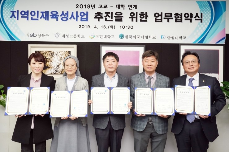 성북구(구청장 이승로)가 비강남권 학교에도 최고의 맞춤형 교육 서비스를 제공하기 위해 팔을 걷고 나섰다. 성북구는 지난 16일 계성고등학교, 국민대학교, 한성대학교, 한국외국어대학교와 『고교-대학 연계 지역인재육성사업』추진을 위한 업무협약을 체결했다고 밝...