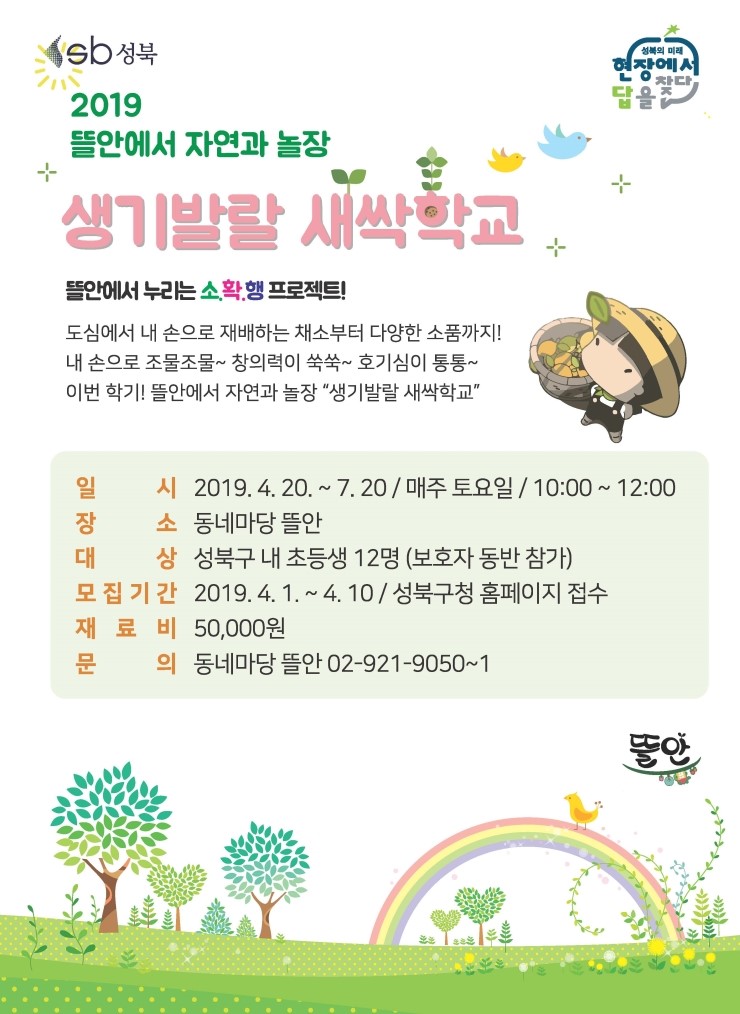 성북구(구청장 이승로)는 4월 10일까지 ‘2019 뜰안에서 자연과 놀장 '생기발랄 새싹학교’ 프로그램에 참여할 12가족을 모집한다. ‘2019 뜰안에서 자연과 놀장 '생기발랄 새싹학교’는 도심에서 만나기 어려운 흙과 옥상 텃밭을 통해 자연환경의 중요성...