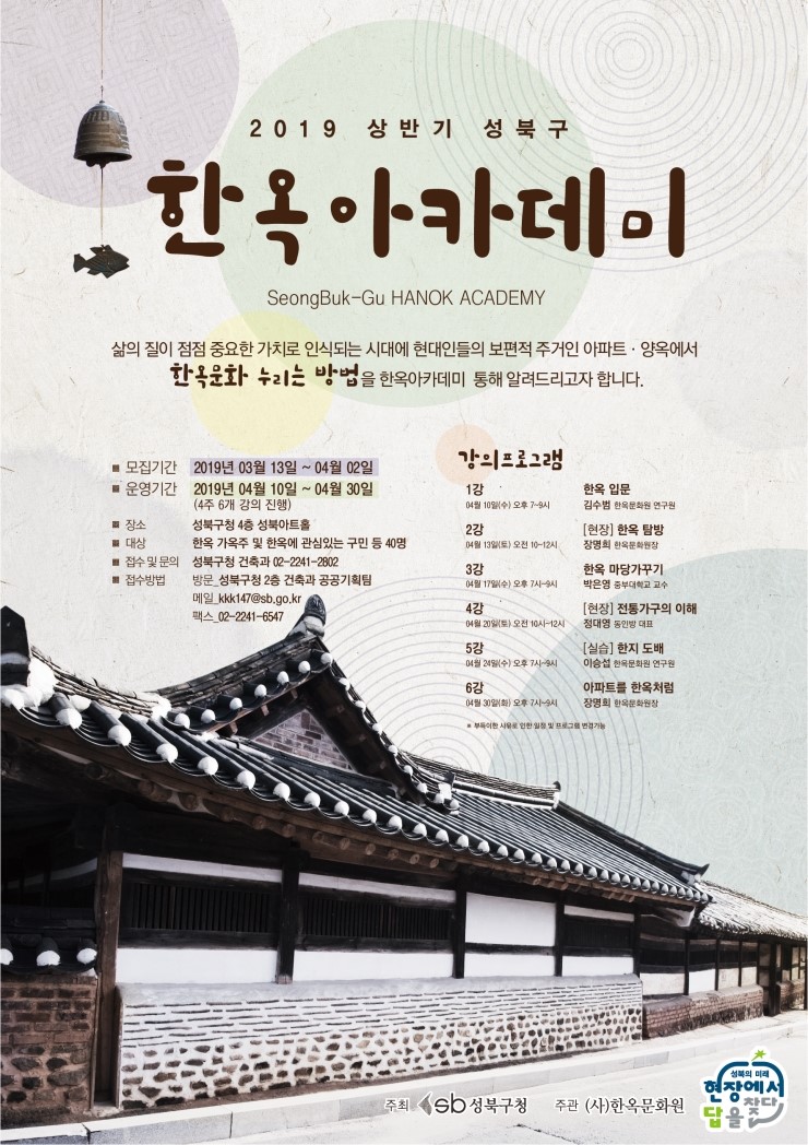 성북구(구청장 이승로)가 한옥의 가치와 아름다움을 재발견하고 실생활에서 한옥을 활용할 수 있는 지식을 널리 알리기 위해 ‘2019년 상반기 한옥아카데미’를 개최한다. 이번 한옥아카데미는 현대인들의 보편적 주거인 아파트, 양옥에서 한옥문화 누리는 방법을 찾...