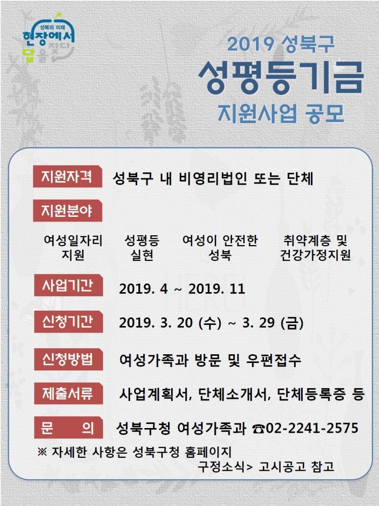 성북구(구청장 이승로)는 성평등한 사회구현, 여성의 사회참여 확대를 위한 ‘2019년 성평등기금 공모사업’을 실시한다. 구에서는 처음으로 지원하는 사업으로 여성의 복지증진을 위해 활동하는 성북구 소재 비영리법인이나 비영리단체는 누구나 참여 가능하며, 여성일자...