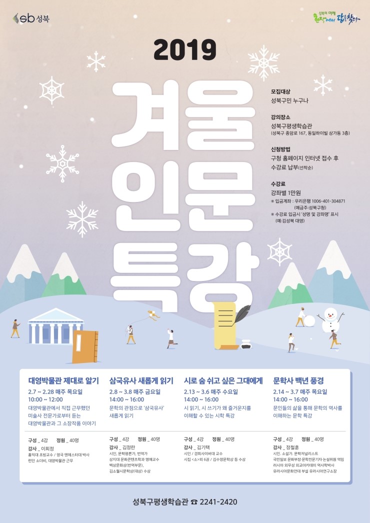 성북구(구청장 이승로)는 2019년 2월「2019 겨울 인문 특강」을 개강한다. 다양한 인문학 분야의 평생학습 프로그램 제공 및 주민의 삶의 질 향상을 위하여 총 4개의 과정을 개설하여 수강생을 모집하며, 2월 7일부터 3월 8일까지 각 과정별로 총 4회...