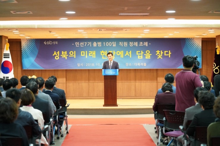 성북구(구청장 이승로)가 지난 8일(월) 오전 8시 30분, 구청 다목적홀에서 현장비전 공유를 위한 직원 정례조례를 개최했다. 성북구가 민선7기 출범 100일을 맞아 성북구 공무원의 새로운 마음가짐을 정립하고 직원 상호간 정보교류의 장으로 활용, 업무...