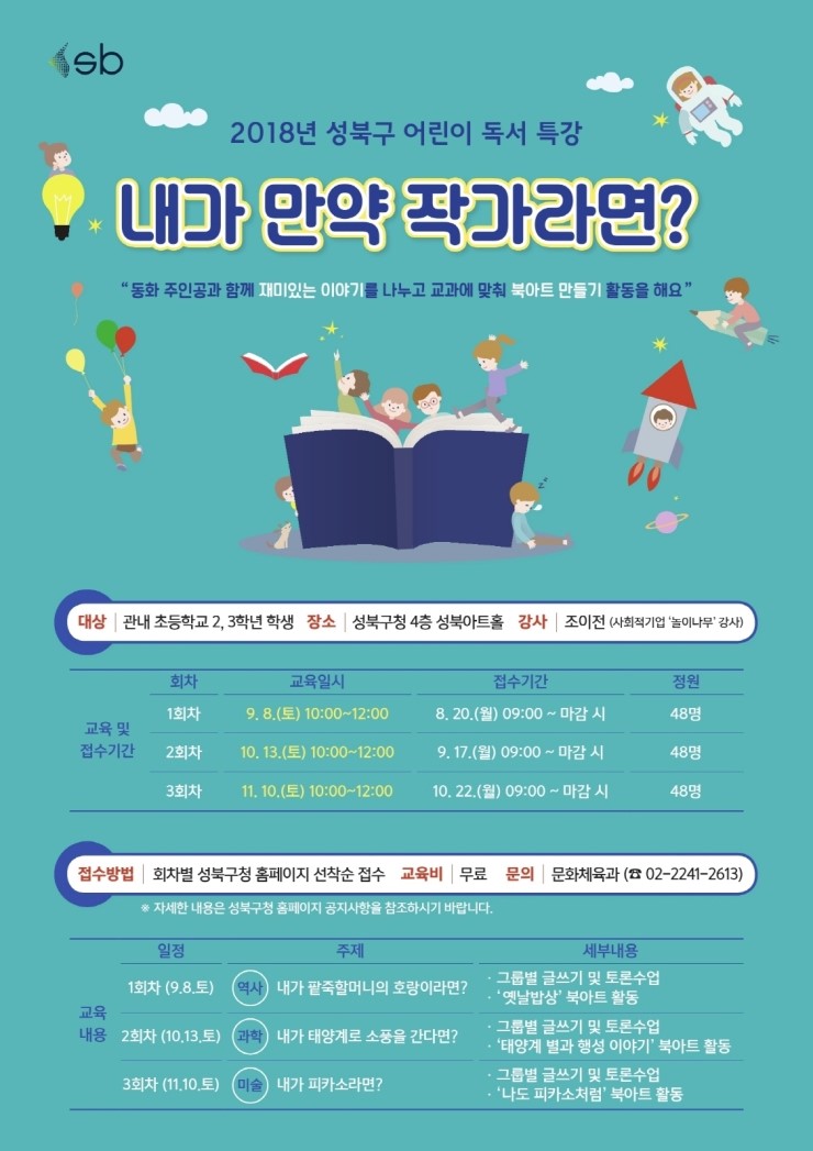 성북구(구청장 이승로)가 오는 8일(토)부터 매월 둘째 주 토요일 오전 10시, 구청 아트홀에서 어린이 독서 특강 “내가 만약 작가라면?”을 개강했다. 관내 초등학교 2, 3학년 학생을 대상으로 진행되는 어린이 독서 특강은 아이들이 책읽기에 관심...