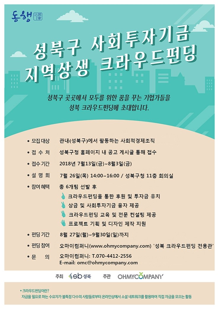 성북구(구청장 이승로)가 사회적경제조직의 자립을 돕는 “지역상생 크라우드 펀딩”을 실시한다. 크라우드 펀딩이란 대중을 뜻하는 ‘크라우드(crowd)’와 자금조달을 뜻하는 ‘펀딩(Funding)’의 합성어로 자금을 필요로 하는 수요자가 불특정 다수의 대중으로부터 온...