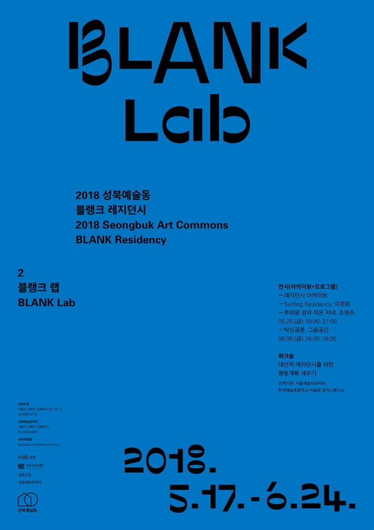 성북문화재단(성북도원, 성북예술창작터)에서는 지난 17일부터 6월 24일까지 2018 성북예술동 ‘블랭크 레지던시’를 개최한다. 이번 2018 성북예술동 ‘블랭크 레지던시’에서는 예술가, 주민, 기관이 기존 아트 레지던시들의 문제점과 대안점을 함께 고...