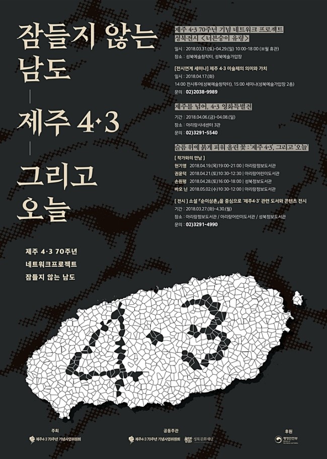 성북구에서 제주4·3을 기리는 행사가 펼쳐진다. 성북문화재단이 제주 4·3 관련 영화, 전시, 작가와의 만남 등을 모아 ‘잠들지 않는 남도, 제주 4·3 그리고 오늘’을 개최한다. ‘잠들지 않는 남도, 제주 4·3 그리고 오늘’은 비극적 역사 속에서 무고하게 ...