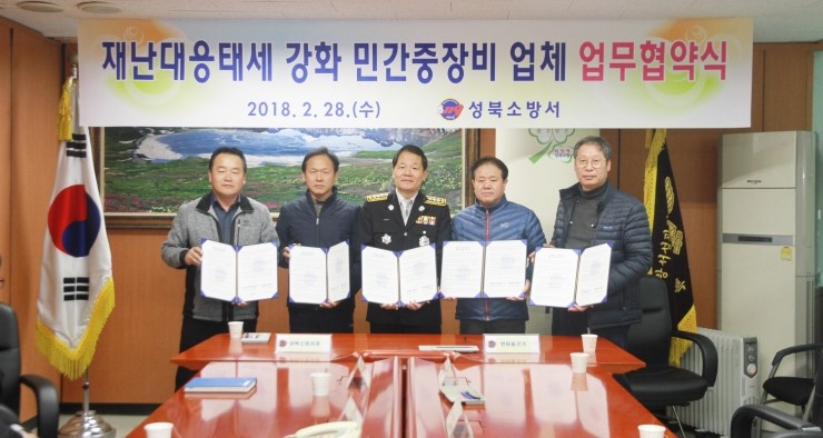 성북소방서(서장 민춘기)는 28일 오전 본서 3층 회의실에서 관내 민간 중장비 업체와의 재난현장에서 민간중장비 지원내용을 골자로 하는 상호 협력 업무협약을 체결했다. 이번 업무협약은 성북소방서와 관내 민간 중장비 업체(한마음 건기, 정진 건설중기, 코리안 건...