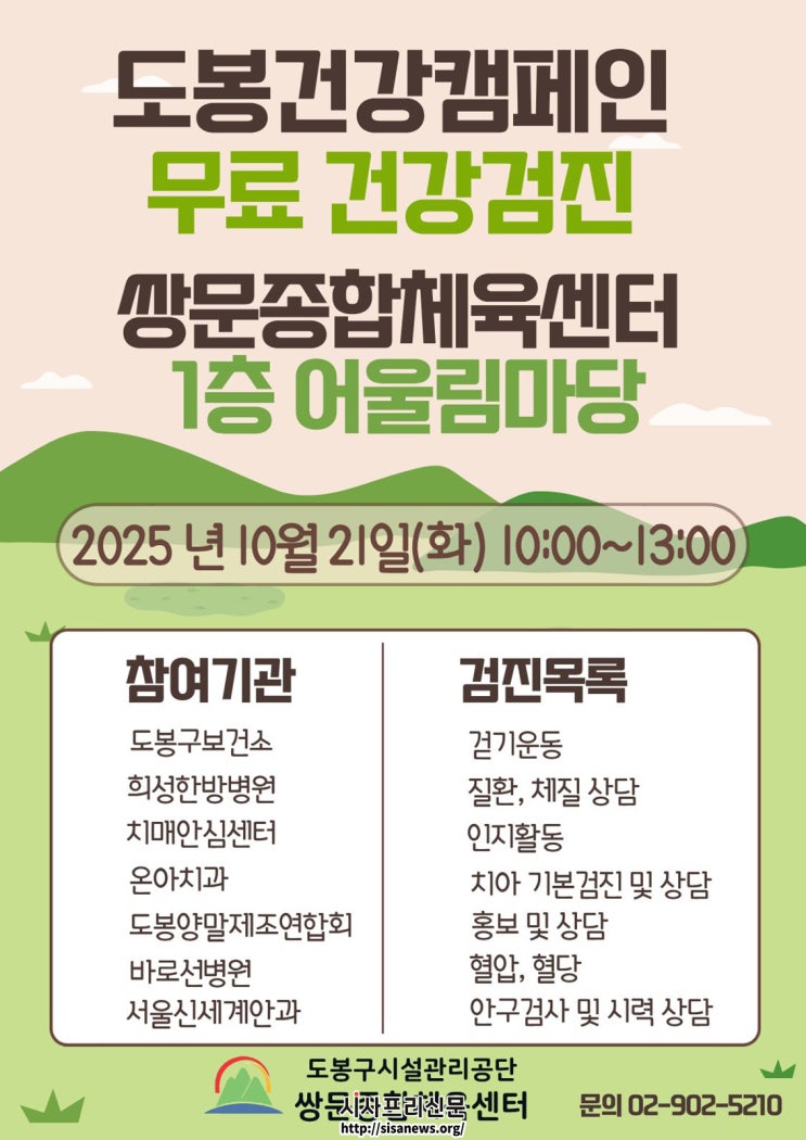 도봉구시설관리공단, 쌍문종합체육센터서 건강캠페인 개최 혈압·혈당 측정부터 건강 상담까지… 주민 누구나 무료 참여 가능 도봉구청(구청장 오언석) 산하 도봉구시설관리공단(이사장 김기수)은 오는 10월 21일(화) 오전 10시부터 오후 1시까지 쌍문종합체육센터...