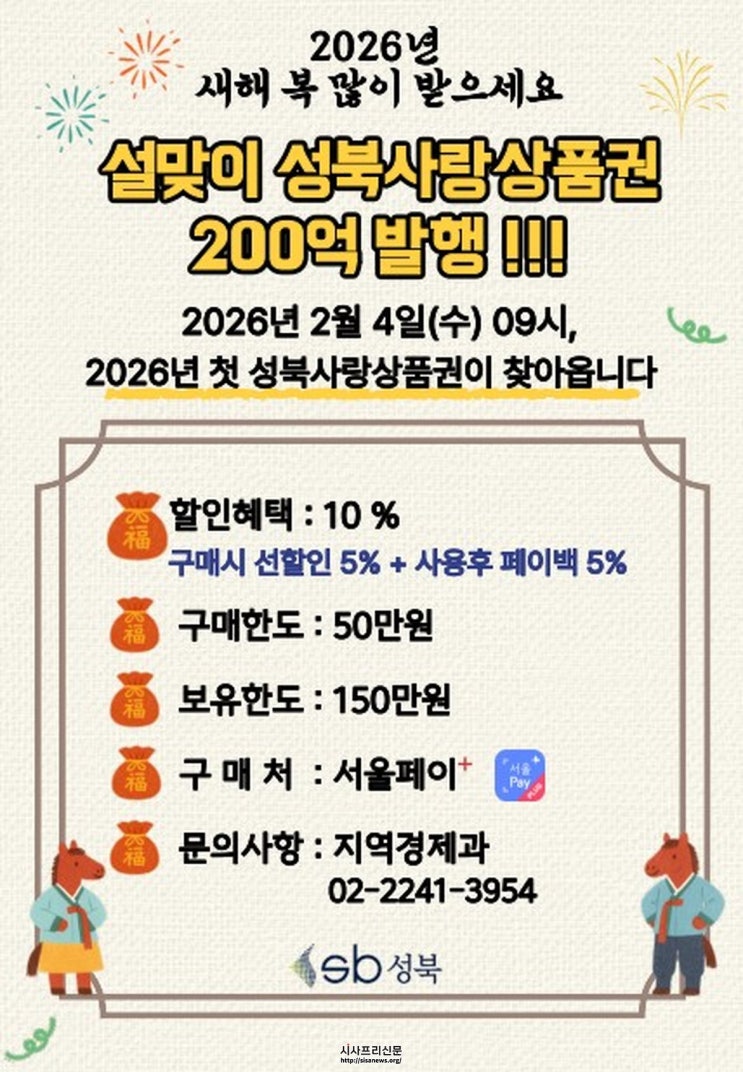 성북구, 설 앞두고 200억 원 규모 성북사랑상품권 발행 서울시 자치구 중 가장 이른 발행을 통한 명절 전 소비 활성화 서울페이플러스 통한 구매 방식과 관내 가맹점 사용 안내 성북구(구청장 이승로)가 설 명절을 앞두고 구민의 장바구니 부담을 완화하고 골...
