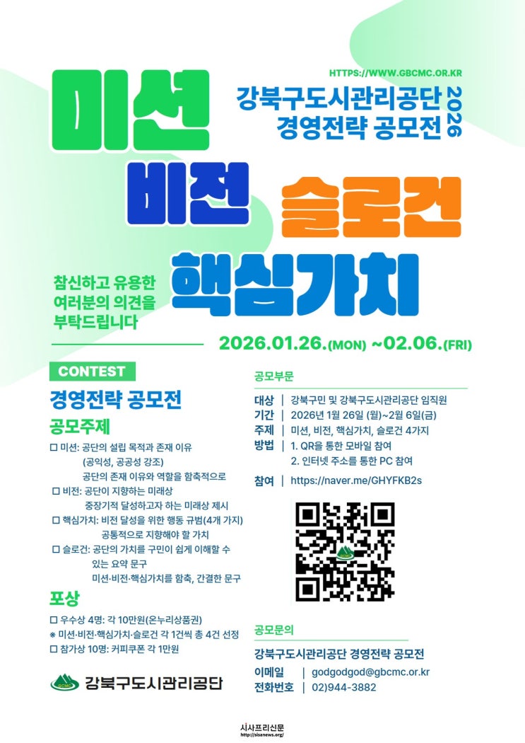 강북구도시관리공단, 경영전략 공모전 개최 강북구도시관리공단(이사장 김윤기, 이하 공단)은 조직 환경 변화와 중장기 경영전략 고도화에 대응하고, 공단의 정체성과 미래 지향점을 명확히 하기 위해 고객과 지역주민, 임직원이 함께 참여하는 『경영혁신과 경영전략 고도화를...
