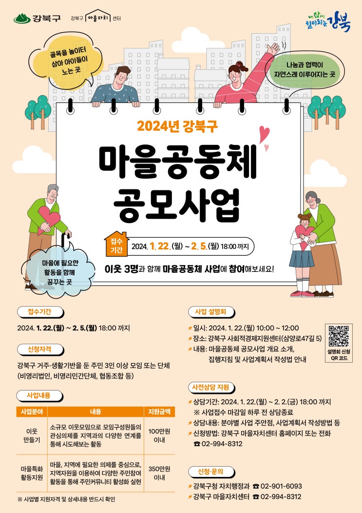 강북구, ‘2024년 강북구 마을공동체 공모사업’ 설명회 개최 강북구(구청장 이순희)는 ‘2024년 강북구 마을공동체 공모사업’을 위한 설명회를 지난 22일(월) 오전 10시에서 12시까지 ‘사회적경제지원센터(삼양동 소재)’ 4층 커뮤니티홀에서 개최했다. ...