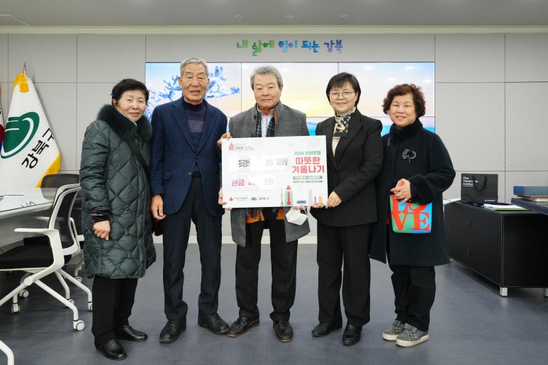 이순희 강북구청장, 송중경로당 사랑의성금 전달식 이순희 강북구청장이 지난달 29일 구청장실에서 송중경로당(회장 김용운) 어르신들로부터 저소득 가정을 위한 '따뜻한 겨울나기' 성금 2백만 원을 전달받았다. 이날 전달식에는 한충현 (사)대한노인회 강북구지회장, ...