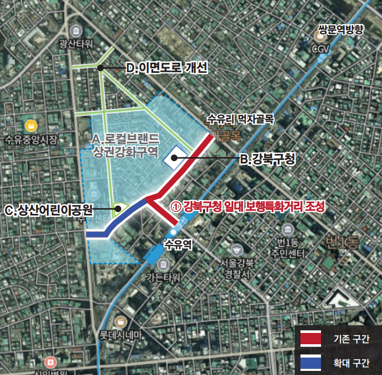 강북구, 구청 앞 보행자 특화거리로 조성 한천로139길, 노해로8길, 도봉로87길 일부 3곳 사업 대상지 강북구(구청장 이순희)가 친환경 디자인 기법 등을 접목해 강북구청 앞 일대를 보행특화거리로 조성한다. 보행특화거리로 조성되는 사업 대상지는 ▲한천로139...
