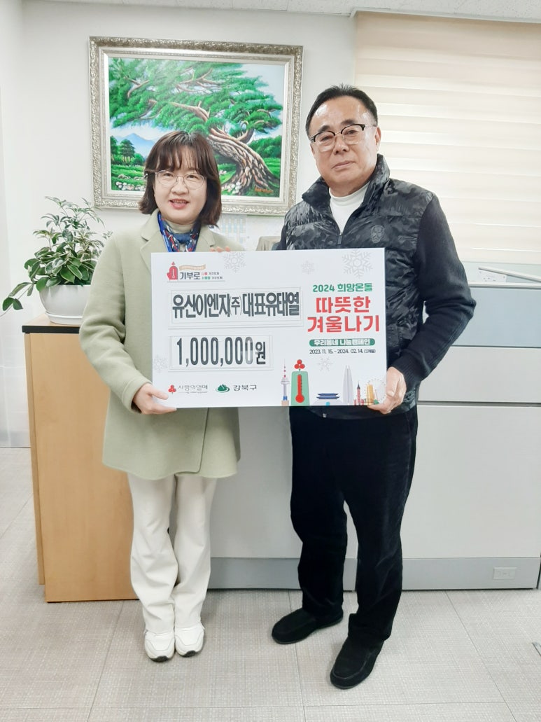강북구 번1동, 유신이엔지(주) 따뜻한 겨울나기 성금 기부 강북구(구청장 이순희) 소방시설공사업 유신이엔지(주) 유태열 대표가 지난 12일 지역의 어려운 이웃을 위해 번1동주민센터에 100만원을 기탁했다. 이 성금은 ‘2024 희망온돌 따뜻한 겨울나기’에 전달...