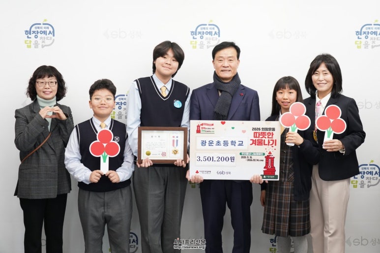 성북구, 광운초에 학생 바자회 성금 350만 원 전달 감사장 수여 6년째 이어진 학교 차원의 나눔 활동과 누적 2천 8백 67만 원 모금 성과 학생회 대표·부대표 참석한 성금 전달식과 구청장 간담회 진행 성북구, 광운초에 학생 바자회 성금 350만 원 전달 감사장...