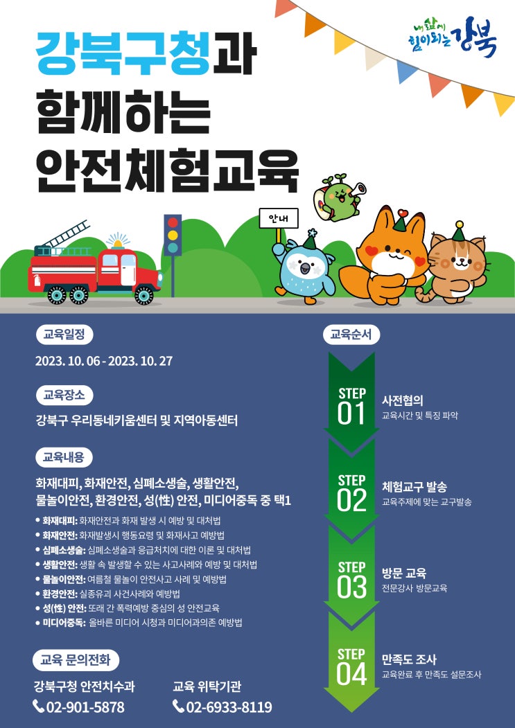 강북구, 아동·청소년에게 ‘찾아가는 안전체험교육’ 실시 강북구(구청장 이순희)는 최근 빈번히 일어나고 있는 각종 재난사고로부터 아동·청소년의 소중한 생명을 지키기 위해 '2023년 찾아가는 안전체험교육'을 실시한다고 밝혔다. 아동‧청소년들은 재난 발생시 ...