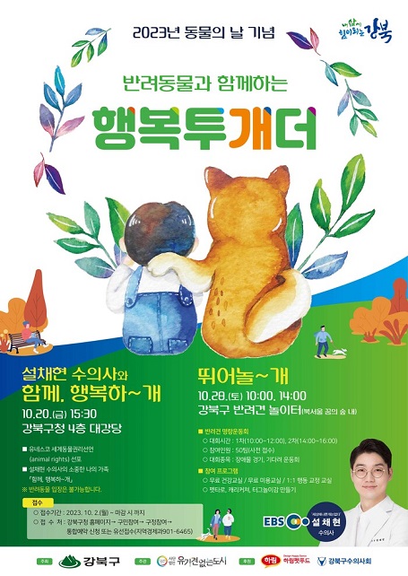강북구, 2023년 ‘동물의 날 기념’행사 개최 10월 20일(금) 2023년 동물의 날 기념행사, 28일(토) 반려동물 명랑 운동회 개최 강북구(구청장 이순희)는 오는 10월 20일(금) 구청 대강당에서 2023년 동물의 날 기념행사(주제: 행복투개더, 강...