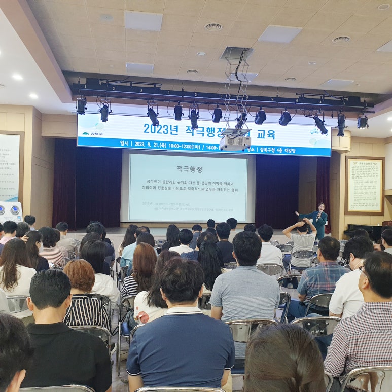 강북구, 2023년 적극행정 직원교육 실시 강북구는 지난달 21일 구청 대강당에서 공직 내 적극행정 문화확산을 위한 ‘2023년 적극행정 직원교육’을 실시했다. 이번 교육은 인사혁신처 적극행정 전문강사로 활동 중인 이승은 강사를 초빙해 ‘나의 행복을 높이는 비...