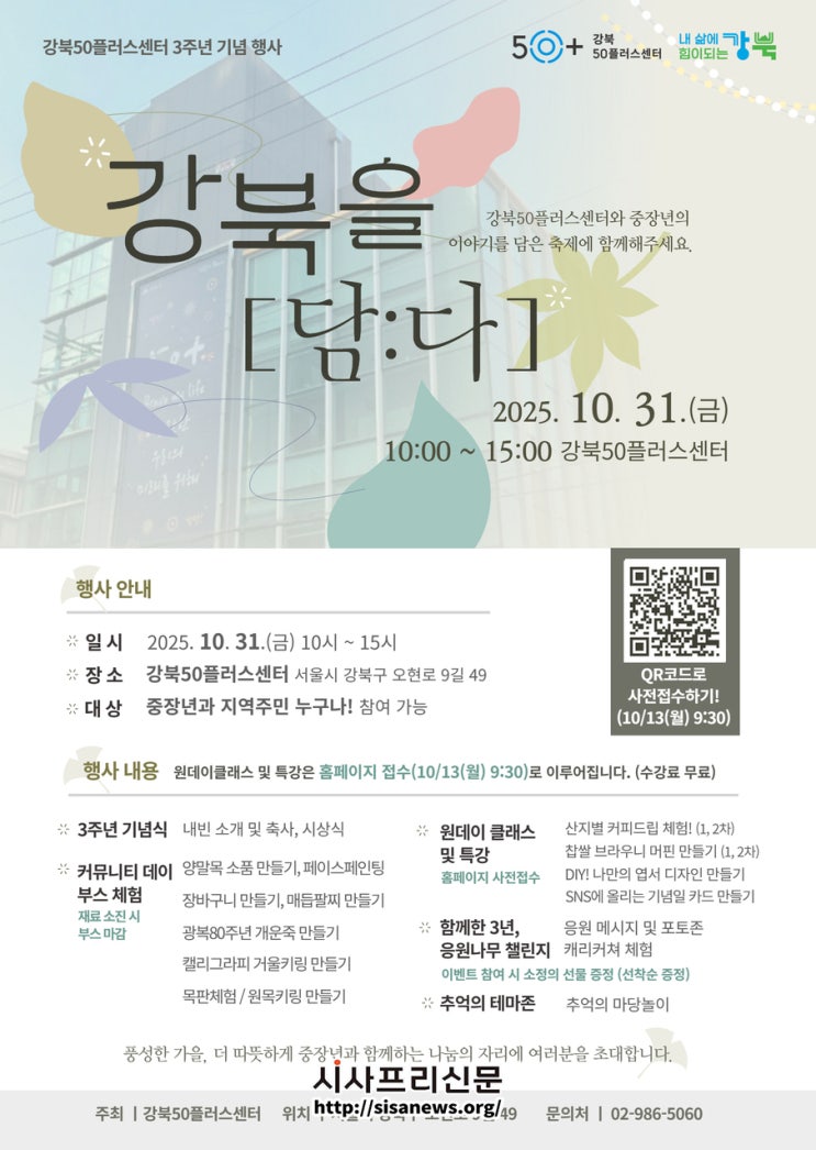 강북50플러스센터, 개관 3주년 기념행사 ‘강북을 [담:다]’ 개최 중장년과 지역주민이 함께하는 따뜻한 소통의 장 체험, 강연, 기념식 등 다채로운 프로그램으로 지역 연대 강화 강북구(구청장 이순희)는 오는 10월 31일(금) 오전 10시부터 ...