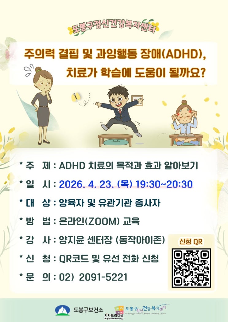 도봉구, 아동·청소년 마음 건강 위한 부모 교육 실시 도봉구(구청장 오언석)가 오는 4월 23일 오후 7시 30분 아동·청소년 보호자와 관계 기관 종사자를 대상으로 주의력결핍 과잉행동장애(ADHD) 온라인 교육(ZOOM)을 진행한다. 이번 교육은 ...